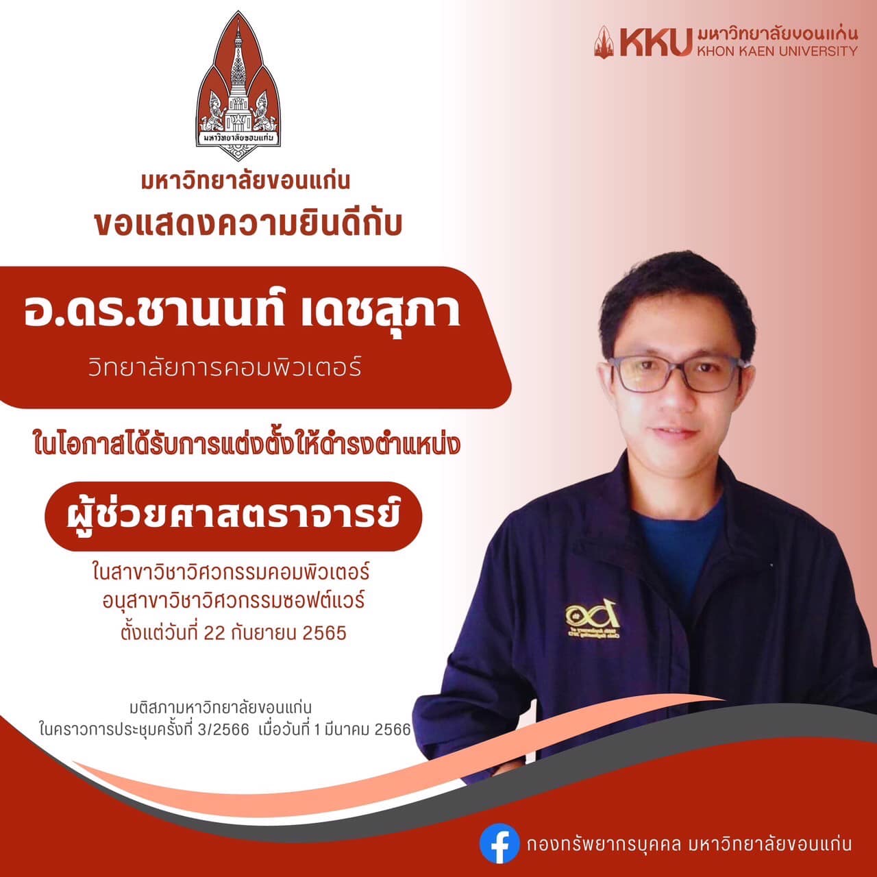ขอแสดงความยินดี อ. ดร.ชานนท์ เดชสุภา อาจารย์ประจำวิทยาลัยการคอมพิวเตอร์ เนื่องในโอกาสที่ได้รับการแต่งตั้งให้ดำรงตำแหน่ง ผู้ช่วยศาสตราจารย์ ในสาขาวิชาวิศวกรรมคอมพิวเตอร์ อนุสาขาวิชาวิศวกรรมซอฟต์แวร์ ตั้งแต่วันที่ 22 กันยายน 2565 ตามมติสภามหาวิทยาลัยขอนแก่น ในคราวการประชุมครั้งที่ 3/2566 เมื่อวันที่ 1 มีนาคม 2566